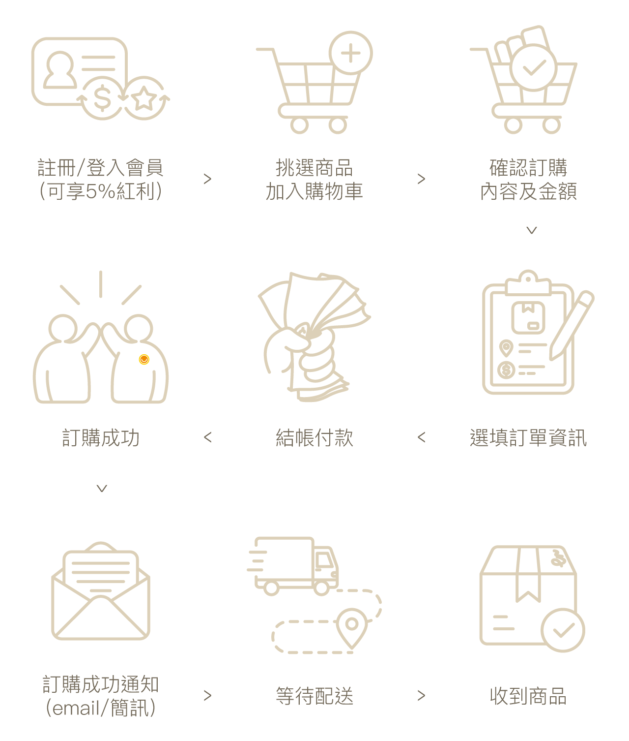 註冊/登入會員➜選擇商品加入購物車➜確認訂購商品、數量及金額➜選擇付款及配送方式➜填寫收件資料選擇發票類型➜結帳付款➜完成訂購。