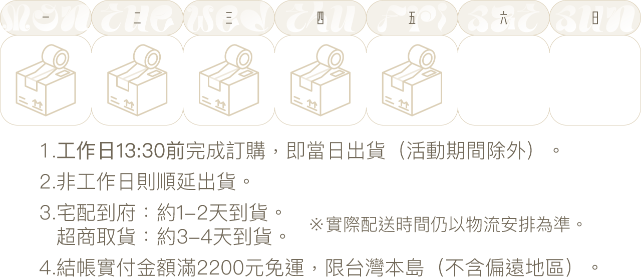 A3.宅配到府(新竹物流、部份地區使用順豐速運或中華郵政)、超商取貨(全家)。