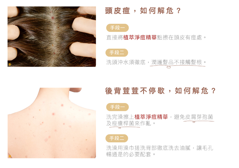 簡單說,這兩種菌是臉上、脖子上老長不完痘痘的關鍵菌。所以,植萃淨痘精華,為了確保對這兩種菌的控管是有效的,必須在對皮膚安全的使用濃度下,做出絕對有效的產品。