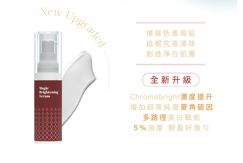 肌底淨白精華乳,核心結構Chromabright+Sepiwhite MSH+Alpha-Arbutin+麥角硫因。